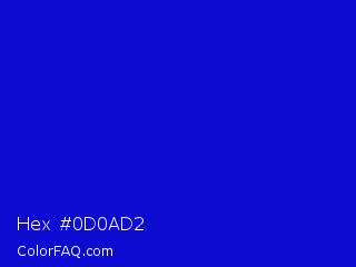 Hex #0d0ad2 Color is a normal indigo color and the nearest color is Medium Blue #0000cd. Hex code #0d0ad2 and RGB value is rgb(13,10,210). In RGB color space, this color is composed of 5% red, 4% green, 82% blue, In CMYK color space, this color is composed of 94% cyan, 95% magenta, 0% yellow , 18% black , In HSL color space, this color has a hue angle of 241° , 91% saturation and 43% lightness.
