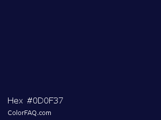 Hex #0d0f37 Color is a very dark blue color and the nearest color is Deep Cove #051040. Hex code #0d0f37 and RGB value is rgb(13,15,55). In RGB color space, this color is composed of 5% red, 6% green, 22% blue, In CMYK color space, this color is composed of 76% cyan, 73% magenta, 0% yellow , 78% black , In HSL color space, this color has a hue angle of 237° , 62% saturation and 13% lightness.