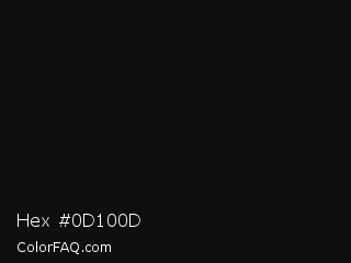 Hex #0d100d Color is a almost black green color and the nearest color is Woodsmoke #0c0d0f. Hex code #0d100d and RGB value is rgb(13,16,13). In RGB color space, this color is composed of 5% red, 6% green, 5% blue, In CMYK color space, this color is composed of 19% cyan, 0% magenta, 19% yellow , 94% black , In HSL color space, this color has a hue angle of 120° , 10% saturation and 6% lightness.