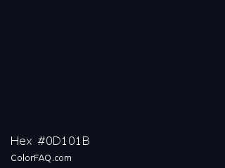Hex #0d101b Color is a almost black blue color and the nearest color is Cinder #0e0e18. Hex code #0d101b and RGB value is rgb(13,16,27). In RGB color space, this color is composed of 5% red, 6% green, 11% blue, In CMYK color space, this color is composed of 52% cyan, 41% magenta, 0% yellow , 89% black , In HSL color space, this color has a hue angle of 227° , 35% saturation and 8% lightness.