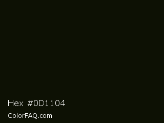 Hex #0d1104 Color is a almost black lime color and the nearest color is Black Forest #0b1304. Hex code #0d1104 and RGB value is rgb(13,17,4). In RGB color space, this color is composed of 5% red, 7% green, 2% blue, In CMYK color space, this color is composed of 24% cyan, 0% magenta, 76% yellow , 93% black , In HSL color space, this color has a hue angle of 78° , 62% saturation and 4% lightness.