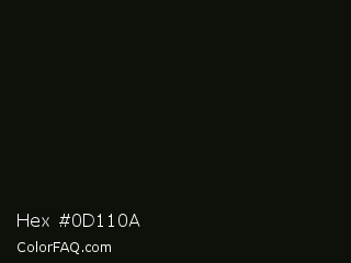 Hex #0d110a Color is a almost black green color and the nearest color is Marshland #0b0f08. Hex code #0d110a and RGB value is rgb(13,17,10). In RGB color space, this color is composed of 5% red, 7% green, 4% blue, In CMYK color space, this color is composed of 24% cyan, 0% magenta, 41% yellow , 93% black , In HSL color space, this color has a hue angle of 94° , 26% saturation and 5% lightness.