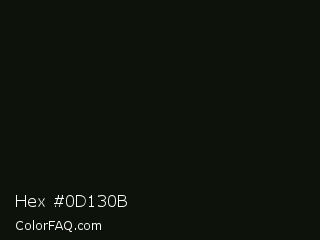 Hex #0d130b Color is a almost black green color and the nearest color is Gordons Green #0b1107. Hex code #0d130b and RGB value is rgb(13,19,11). In RGB color space, this color is composed of 5% red, 7% green, 4% blue, In CMYK color space, this color is composed of 32% cyan, 0% magenta, 42% yellow , 93% black , In HSL color space, this color has a hue angle of 105° , 27% saturation and 6% lightness.