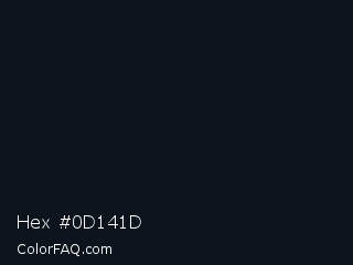 Hex #0d141d Color is a almost black blue color and the nearest color is Vulcan #10121d. Hex code #0d141d and RGB value is rgb(13,20,29). In RGB color space, this color is composed of 5% red, 8% green, 11% blue, In CMYK color space, this color is composed of 55% cyan, 31% magenta, 0% yellow , 89% black , In HSL color space, this color has a hue angle of 214° , 38% saturation and 8% lightness.