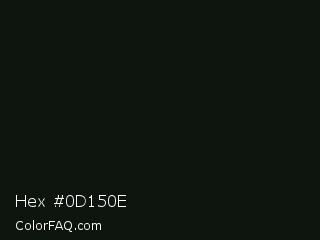 Hex #0d150e Color is a almost black green color and the nearest color is Racing Green #0c1911. Hex code #0d150e and RGB value is rgb(13,21,14). In RGB color space, this color is composed of 5% red, 8% green, 5% blue, In CMYK color space, this color is composed of 38% cyan, 0% magenta, 33% yellow , 92% black , In HSL color space, this color has a hue angle of 128° , 24% saturation and 7% lightness.
