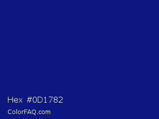 Hex #0d1782 Color is a dark blue color and the nearest color is Dark Imperial Blue #00147e. Hex code #0d1782 and RGB value is rgb(13,23,130). In RGB color space, this color is composed of 5% red, 9% green, 51% blue, In CMYK color space, this color is composed of 90% cyan, 82% magenta, 0% yellow , 49% black , In HSL color space, this color has a hue angle of 235° , 82% saturation and 28% lightness.
