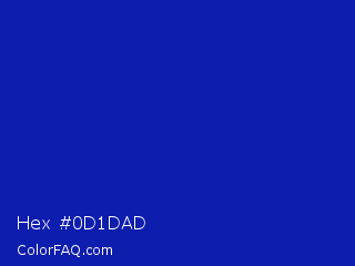 Hex #0d1dad Color is a normal blue color and the nearest color is Blue Pantone #0018a8. Hex code #0d1dad and RGB value is rgb(13,29,173). In RGB color space, this color is composed of 5% red, 11% green, 68% blue, In CMYK color space, this color is composed of 92% cyan, 83% magenta, 0% yellow , 32% black , In HSL color space, this color has a hue angle of 234° , 86% saturation and 36% lightness.