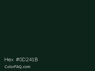 Hex #0d241b Color is a very dark green color and the nearest color is Aztec #0d1c19. Hex code #0d241b and RGB value is rgb(13,36,27). In RGB color space, this color is composed of 5% red, 14% green, 11% blue, In CMYK color space, this color is composed of 64% cyan, 0% magenta, 25% yellow , 86% black , In HSL color space, this color has a hue angle of 157° , 47% saturation and 10% lightness.