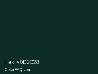 Hex #0d2c28 Color is a very dark cyan color and the nearest color is Firefly #0e2a30. Hex code #0d2c28 and RGB value is rgb(13,44,40). In RGB color space, this color is composed of 5% red, 17% green, 16% blue, In CMYK color space, this color is composed of 70% cyan, 0% magenta, 9% yellow , 83% black , In HSL color space, this color has a hue angle of 172° , 54% saturation and 11% lightness.