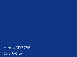 Hex #0d3786 Color is a dark blue color and the nearest color is Dark Cerulean #08457e. Hex code #0d3786 and RGB value is rgb(13,55,134). In RGB color space, this color is composed of 5% red, 22% green, 53% blue, In CMYK color space, this color is composed of 90% cyan, 59% magenta, 0% yellow , 47% black , In HSL color space, this color has a hue angle of 219° , 82% saturation and 29% lightness.