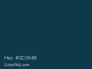 Hex #0d394b Color is a very dark blue color and the nearest color is Tarawera #073a50. Hex code #0d394b and RGB value is rgb(13,57,75). In RGB color space, this color is composed of 5% red, 22% green, 29% blue, In CMYK color space, this color is composed of 83% cyan, 24% magenta, 0% yellow , 71% black , In HSL color space, this color has a hue angle of 197° , 70% saturation and 17% lightness.