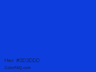 Hex #0d3ddd Color is a normal blue color and the nearest color is Palatinate Blue #273be2. Hex code #0d3ddd and RGB value is rgb(13,61,221). In RGB color space, this color is composed of 5% red, 24% green, 87% blue, In CMYK color space, this color is composed of 94% cyan, 72% magenta, 0% yellow , 13% black , In HSL color space, this color has a hue angle of 226° , 89% saturation and 46% lightness.