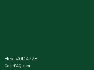 Hex #0d472b Color is a very dark green color and the nearest color is Sherwood Green #02402c. Hex code #0d472b and RGB value is rgb(13,71,43). In RGB color space, this color is composed of 5% red, 28% green, 17% blue, In CMYK color space, this color is composed of 82% cyan, 0% magenta, 39% yellow , 72% black , In HSL color space, this color has a hue angle of 151° , 69% saturation and 16% lightness.