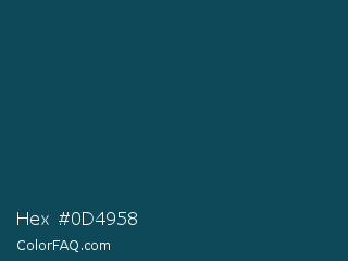 Hex #0d4958 Color is a very dark cyan color and the nearest color is Teal Blue #044259. Hex code #0d4958 and RGB value is rgb(13,73,88). In RGB color space, this color is composed of 5% red, 29% green, 35% blue, In CMYK color space, this color is composed of 85% cyan, 17% magenta, 0% yellow , 65% black , In HSL color space, this color has a hue angle of 192° , 74% saturation and 20% lightness.