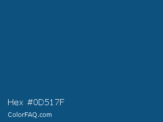 Hex #0d517f Color is a dark blue color and the nearest color is Chathams Blue #175579. Hex code #0d517f and RGB value is rgb(13,81,127). In RGB color space, this color is composed of 5% red, 32% green, 50% blue, In CMYK color space, this color is composed of 90% cyan, 36% magenta, 0% yellow , 50% black , In HSL color space, this color has a hue angle of 204° , 81% saturation and 27% lightness.