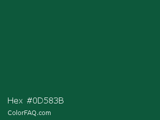 Hex #0d583b Color is a very dark green color and the nearest color is Sacramento State Green #00563f. Hex code #0d583b and RGB value is rgb(13,88,59). In RGB color space, this color is composed of 5% red, 35% green, 23% blue, In CMYK color space, this color is composed of 85% cyan, 0% magenta, 33% yellow , 65% black , In HSL color space, this color has a hue angle of 157° , 74% saturation and 20% lightness.