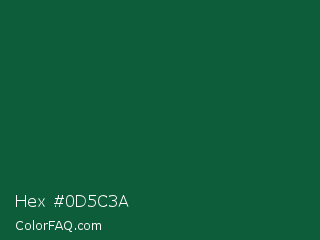 Hex #0d5c3a Color is a very dark green color and the nearest color is Sacramento State Green #00563f. Hex code #0d5c3a and RGB value is rgb(13,92,58). In RGB color space, this color is composed of 5% red, 36% green, 23% blue, In CMYK color space, this color is composed of 86% cyan, 0% magenta, 37% yellow , 64% black , In HSL color space, this color has a hue angle of 154° , 75% saturation and 21% lightness.