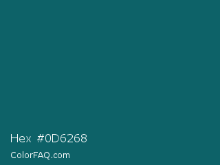 Hex #0d6268 Color is a dark cyan color and the nearest color is Blue Stone #016162. Hex code #0d6268 and RGB value is rgb(13,98,104). In RGB color space, this color is composed of 5% red, 38% green, 41% blue, In CMYK color space, this color is composed of 88% cyan, 6% magenta, 0% yellow , 59% black , In HSL color space, this color has a hue angle of 184° , 78% saturation and 23% lightness.