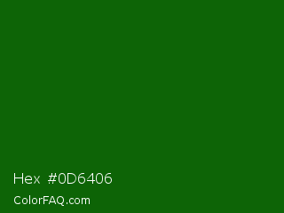 Hex #0d6406 Color is a very dark green color and the nearest color is San Felix #0b6207. Hex code #0d6406 and RGB value is rgb(13,100,6). In RGB color space, this color is composed of 5% red, 39% green, 2% blue, In CMYK color space, this color is composed of 87% cyan, 0% magenta, 94% yellow , 61% black , In HSL color space, this color has a hue angle of 116° , 89% saturation and 21% lightness.