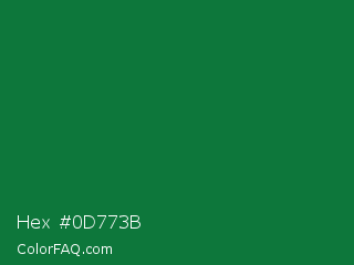 Hex #0d773b Color is a dark green color and the nearest color is La Salle Green #087830. Hex code #0d773b and RGB value is rgb(13,119,59). In RGB color space, this color is composed of 5% red, 47% green, 23% blue, In CMYK color space, this color is composed of 89% cyan, 0% magenta, 50% yellow , 53% black , In HSL color space, this color has a hue angle of 146° , 80% saturation and 26% lightness.
