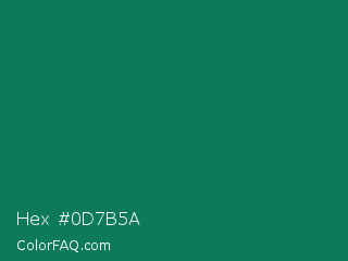 Hex #0d7b5a Color is a dark green color and the nearest color is Deep Green Cyan Turquoise #0e7c61. Hex code #0d7b5a and RGB value is rgb(13,123,90). In RGB color space, this color is composed of 5% red, 48% green, 35% blue, In CMYK color space, this color is composed of 89% cyan, 0% magenta, 27% yellow , 52% black , In HSL color space, this color has a hue angle of 162° , 81% saturation and 27% lightness.