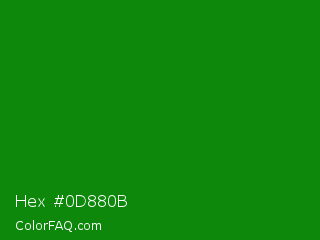 Hex #0d880b Color is a dark green color and the nearest color is India Green #138808. Hex code #0d880b and RGB value is rgb(13,136,11). In RGB color space, this color is composed of 5% red, 53% green, 4% blue, In CMYK color space, this color is composed of 90% cyan, 0% magenta, 92% yellow , 47% black , In HSL color space, this color has a hue angle of 119° , 85% saturation and 29% lightness.