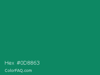 Hex #0d8863 Color is a dark green color and the nearest color is Deep Green Cyan Turquoise #0e7c61. Hex code #0d8863 and RGB value is rgb(13,136,99). In RGB color space, this color is composed of 5% red, 53% green, 39% blue, In CMYK color space, this color is composed of 90% cyan, 0% magenta, 27% yellow , 47% black , In HSL color space, this color has a hue angle of 162° , 83% saturation and 29% lightness.