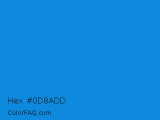 Hex #0d8add Color is a normal blue color and the nearest color is Rich Electric Blue #0892d0. Hex code #0d8add and RGB value is rgb(13,138,221). In RGB color space, this color is composed of 5% red, 54% green, 87% blue, In CMYK color space, this color is composed of 94% cyan, 38% magenta, 0% yellow , 13% black , In HSL color space, this color has a hue angle of 204° , 89% saturation and 46% lightness.