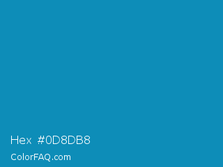 Hex #0d8db8 Color is a normal blue color and the nearest color is Blue Green #0d98ba. Hex code #0d8db8 and RGB value is rgb(13,141,184). In RGB color space, this color is composed of 5% red, 55% green, 72% blue, In CMYK color space, this color is composed of 93% cyan, 23% magenta, 0% yellow , 28% black , In HSL color space, this color has a hue angle of 195° , 87% saturation and 39% lightness.
