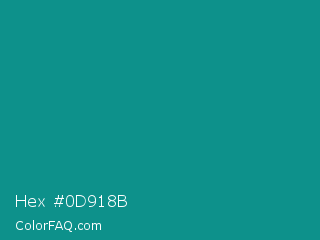 Hex #0d918b Color is a normal cyan color and the nearest color is Blue Chill #0c8990. Hex code #0d918b and RGB value is rgb(13,145,139). In RGB color space, this color is composed of 5% red, 57% green, 55% blue, In CMYK color space, this color is composed of 91% cyan, 0% magenta, 4% yellow , 43% black , In HSL color space, this color has a hue angle of 177° , 84% saturation and 31% lightness.