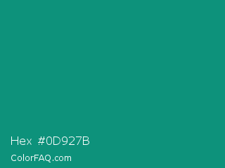 Hex #0d927b Color is a normal cyan color and the nearest color is Gossamer #069b81. Hex code #0d927b and RGB value is rgb(13,146,123). In RGB color space, this color is composed of 5% red, 57% green, 48% blue, In CMYK color space, this color is composed of 91% cyan, 0% magenta, 16% yellow , 43% black , In HSL color space, this color has a hue angle of 170° , 84% saturation and 31% lightness.