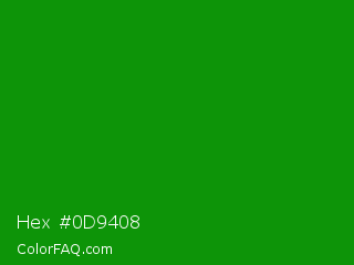 Hex #0d9408 Color is a normal green color and the nearest color is India Green #138808. Hex code #0d9408 and RGB value is rgb(13,148,8). In RGB color space, this color is composed of 5% red, 58% green, 3% blue, In CMYK color space, this color is composed of 91% cyan, 0% magenta, 95% yellow , 42% black , In HSL color space, this color has a hue angle of 118° , 90% saturation and 31% lightness.