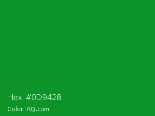 Hex #0d9428 Color is a normal green color and the nearest color is North Texas Green #059033. Hex code #0d9428 and RGB value is rgb(13,148,40). In RGB color space, this color is composed of 5% red, 58% green, 16% blue, In CMYK color space, this color is composed of 91% cyan, 0% magenta, 73% yellow , 42% black , In HSL color space, this color has a hue angle of 132° , 84% saturation and 32% lightness.