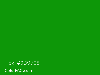 Hex #0d9708 Color is a normal green color and the nearest color is India Green #138808. Hex code #0d9708 and RGB value is rgb(13,151,8). In RGB color space, this color is composed of 5% red, 59% green, 3% blue, In CMYK color space, this color is composed of 91% cyan, 0% magenta, 95% yellow , 41% black , In HSL color space, this color has a hue angle of 118° , 90% saturation and 31% lightness.