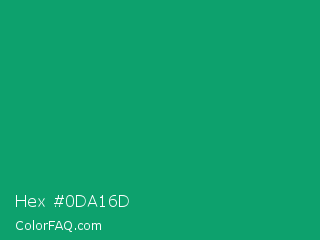 Hex #0da16d Color is a normal green color and the nearest color is Green Haze #01a368. Hex code #0da16d and RGB value is rgb(13,161,109). In RGB color space, this color is composed of 5% red, 63% green, 43% blue, In CMYK color space, this color is composed of 92% cyan, 0% magenta, 32% yellow , 37% black , In HSL color space, this color has a hue angle of 159° , 85% saturation and 34% lightness.