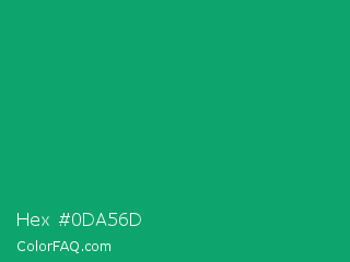 Hex #0da56d Color is a normal green color and the nearest color is Green Haze #01a368. Hex code #0da56d and RGB value is rgb(13,165,109). In RGB color space, this color is composed of 5% red, 65% green, 43% blue, In CMYK color space, this color is composed of 92% cyan, 0% magenta, 34% yellow , 35% black , In HSL color space, this color has a hue angle of 158° , 85% saturation and 35% lightness.