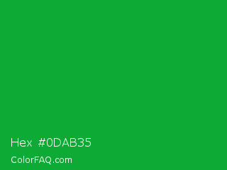 Hex #0dab35 Color is a normal green color and the nearest color is Green Pantone #00ad43. Hex code #0dab35 and RGB value is rgb(13,171,53). In RGB color space, this color is composed of 5% red, 67% green, 21% blue, In CMYK color space, this color is composed of 92% cyan, 0% magenta, 69% yellow , 33% black , In HSL color space, this color has a hue angle of 135° , 86% saturation and 36% lightness.