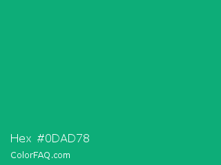 Hex #0dad78 Color is a normal green color and the nearest color is Green Munsell #00a877. Hex code #0dad78 and RGB value is rgb(13,173,120). In RGB color space, this color is composed of 5% red, 68% green, 47% blue, In CMYK color space, this color is composed of 92% cyan, 0% magenta, 31% yellow , 32% black , In HSL color space, this color has a hue angle of 160° , 86% saturation and 36% lightness.