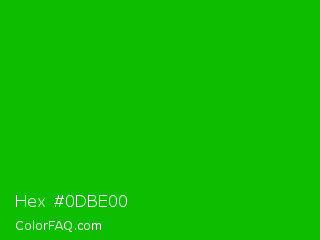 Hex #0dbe00 Color is a normal green color and the nearest color is Islamic Green #009000. Hex code #0dbe00 and RGB value is rgb(13,190,0). In RGB color space, this color is composed of 5% red, 75% green, 0% blue, In CMYK color space, this color is composed of 93% cyan, 0% magenta, 100% yellow , 25% black , In HSL color space, this color has a hue angle of 116° , 100% saturation and 37% lightness.