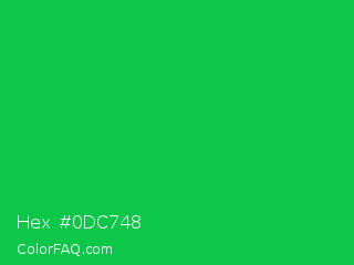 Hex #0dc748 Color is a normal green color and the nearest color is Dark Pastel Green #03c03c. Hex code #0dc748 and RGB value is rgb(13,199,72). In RGB color space, this color is composed of 5% red, 78% green, 28% blue, In CMYK color space, this color is composed of 93% cyan, 0% magenta, 64% yellow , 22% black , In HSL color space, this color has a hue angle of 139° , 88% saturation and 42% lightness.
