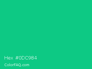 Hex #0dc984 Color is a normal green color and the nearest color is Caribbean Green #00cc99. Hex code #0dc984 and RGB value is rgb(13,201,132). In RGB color space, this color is composed of 5% red, 79% green, 52% blue, In CMYK color space, this color is composed of 94% cyan, 0% magenta, 34% yellow , 21% black , In HSL color space, this color has a hue angle of 158° , 88% saturation and 42% lightness.