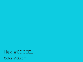 Hex #0dcce1 Color is a normal cyan color and the nearest color is Dark Turquoise #00ced1. Hex code #0dcce1 and RGB value is rgb(13,204,225). In RGB color space, this color is composed of 5% red, 80% green, 88% blue, In CMYK color space, this color is composed of 94% cyan, 9% magenta, 0% yellow , 12% black , In HSL color space, this color has a hue angle of 186° , 89% saturation and 47% lightness.