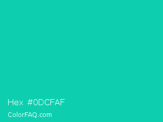 Hex #0dcfaf Color is a normal cyan color and the nearest color is Amazonite #00c4b0. Hex code #0dcfaf and RGB value is rgb(13,207,175). In RGB color space, this color is composed of 5% red, 81% green, 69% blue, In CMYK color space, this color is composed of 94% cyan, 0% magenta, 15% yellow , 19% black , In HSL color space, this color has a hue angle of 170° , 88% saturation and 43% lightness.