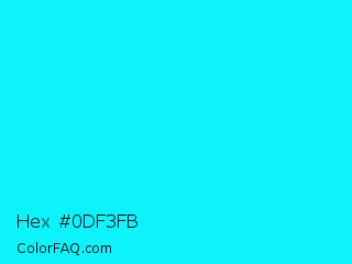 Hex #0df3fb Color is a normal cyan color and the nearest color is Loeen #15f2fd. Hex code #0df3fb and RGB value is rgb(13,243,251). In RGB color space, this color is composed of 5% red, 95% green, 98% blue, In CMYK color space, this color is composed of 95% cyan, 3% magenta, 0% yellow , 2% black , In HSL color space, this color has a hue angle of 182° , 97% saturation and 52% lightness.