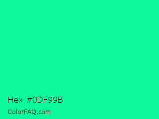 Hex #0df99b Color is a normal green color and the nearest color is Medium Spring Green #00fa9a. Hex code #0df99b and RGB value is rgb(13,249,155). In RGB color space, this color is composed of 5% red, 98% green, 61% blue, In CMYK color space, this color is composed of 95% cyan, 0% magenta, 38% yellow , 2% black , In HSL color space, this color has a hue angle of 156° , 95% saturation and 51% lightness.