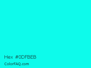 Hex #0dfbeb Color is a normal cyan color and the nearest color is Turquoise Blue #00ffef. Hex code #0dfbeb and RGB value is rgb(13,251,235). In RGB color space, this color is composed of 5% red, 98% green, 92% blue, In CMYK color space, this color is composed of 95% cyan, 0% magenta, 6% yellow , 2% black , In HSL color space, this color has a hue angle of 176° , 97% saturation and 52% lightness.