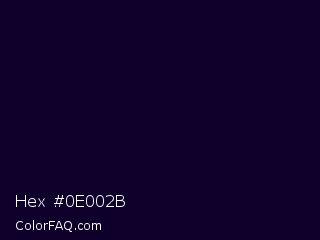 Hex #0e002b Color is a almost black indigo color and the nearest color is Black Rock #0d0332. Hex code #0e002b and RGB value is rgb(14,0,43). In RGB color space, this color is composed of 5% red, 0% green, 17% blue, In CMYK color space, this color is composed of 67% cyan, 100% magenta, 0% yellow , 83% black , In HSL color space, this color has a hue angle of 260° , 100% saturation and 8% lightness.