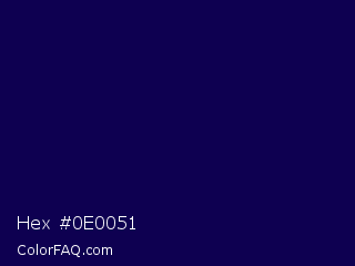 Hex #0e0051 Color is a very dark indigo color and the nearest color is Tolopea #1b0245. Hex code #0e0051 and RGB value is rgb(14,0,81). In RGB color space, this color is composed of 5% red, 0% green, 32% blue, In CMYK color space, this color is composed of 83% cyan, 100% magenta, 0% yellow , 68% black , In HSL color space, this color has a hue angle of 250° , 100% saturation and 16% lightness.