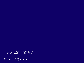 Hex #0e0067 Color is a very dark indigo color and the nearest color is Arapawa #110c6c. Hex code #0e0067 and RGB value is rgb(14,0,103). In RGB color space, this color is composed of 5% red, 0% green, 40% blue, In CMYK color space, this color is composed of 86% cyan, 100% magenta, 0% yellow , 60% black , In HSL color space, this color has a hue angle of 248° , 100% saturation and 20% lightness.