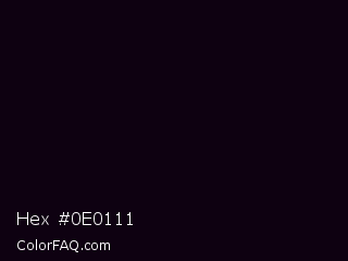 Hex #0e0111 Color is a almost black purple color and the nearest color is Jaguar #080110. Hex code #0e0111 and RGB value is rgb(14,1,17). In RGB color space, this color is composed of 5% red, 0% green, 7% blue, In CMYK color space, this color is composed of 18% cyan, 94% magenta, 0% yellow , 93% black , In HSL color space, this color has a hue angle of 289° , 89% saturation and 4% lightness.